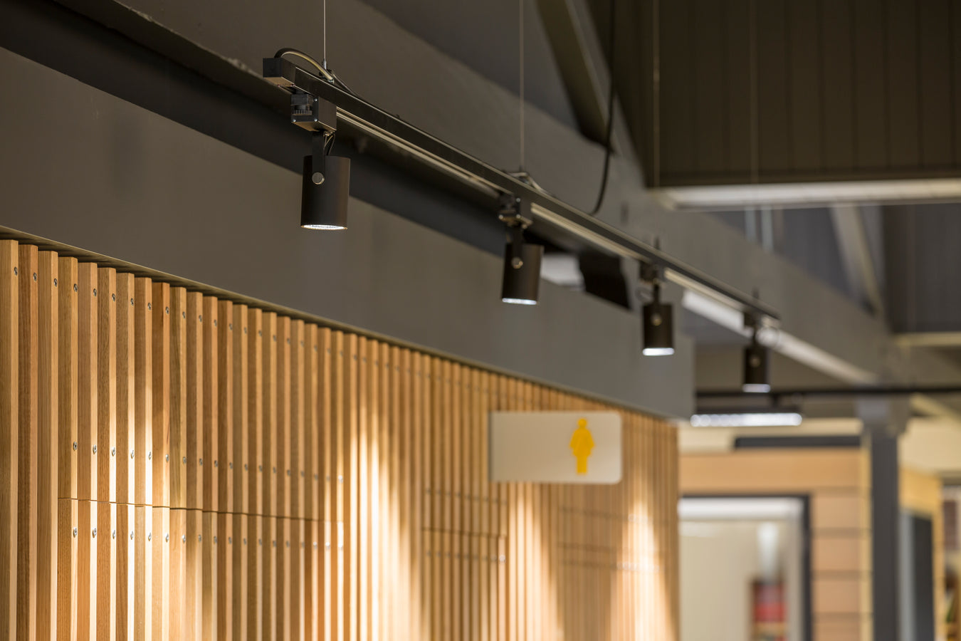 This area was lit using suspended three-circuit track with a mix of OMS Avior spotlights and OMS Lambda louvred linear fittings attached to the track. This allowed flexibility of design and future-proofed the areas for later changes of use.
