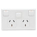 Socket outlet assembly for horizontal installations. Twin switched socket with extra switch. 600 Series cover and socket grid are included. PDL 600. Colour: White Rated current: 10A (socket), 16AX (extra switch). Operating voltage 240V a.c. 50Hz Note: Requires installation by an appropriately licenced electrician.